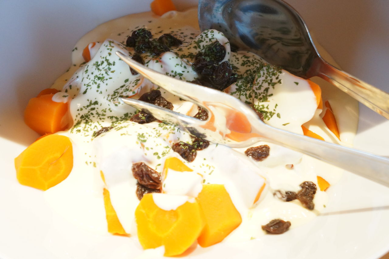 濃厚なソースにからむさつまいもと小松菜の相性がいいです。